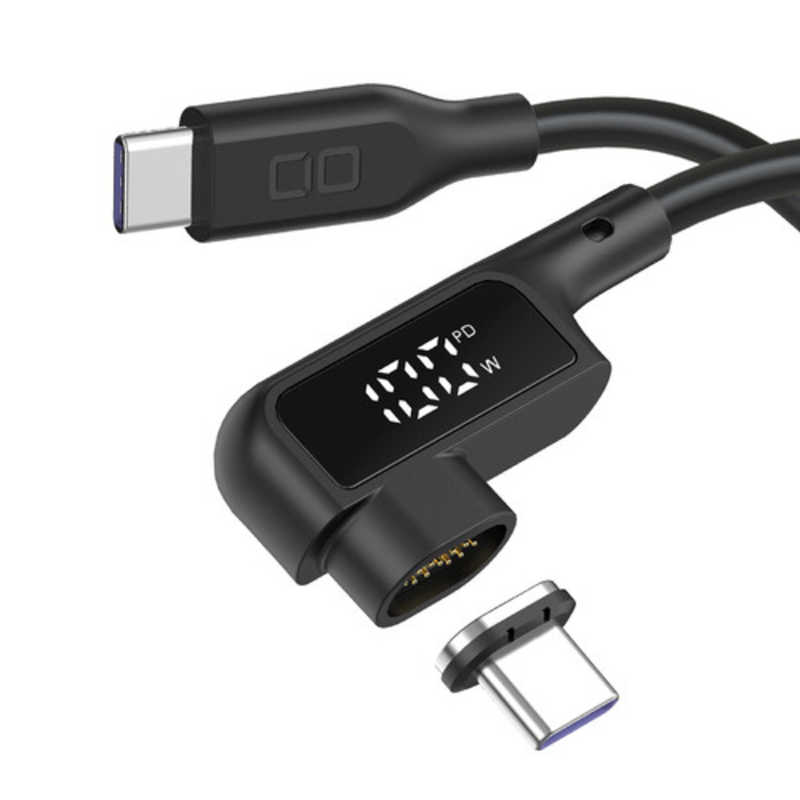 【商品解説】・マグネット端子で簡単着脱!100W対応で様々なデバイスを充電可能・手触りなめらかなシリコン被覆で、絡まりにくいケーブルを実現!・リアルタイムで電力が見える!心くすぐる出力表示ディスプレイ!・ゲームや動画視聴、PCの充電等に場所を取らないL字型プラグケーブル長さ:1mカラー:ブラック