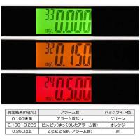 ● 測定結果は3色(グリーン、オレンジ、赤)で表示・ グリーン…0.100mg/L未満(アラーム音なし)・ オレンジ…0.100?0.225mg/L(ゆっくりしたアラーム音「ピッ、ピッ」)・ 赤…0.250mg/L以上(速いアラーム音「ピピピピ」)