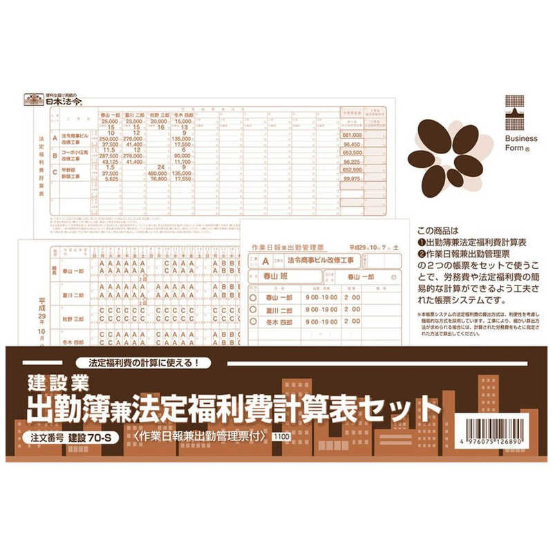 【商品解説】「建設業出勤簿兼法定福利費計算表セット」(建設70−S)は、国や元請などの指導により、見積書などに明記を求められるなど近年重要性が高まっている法定福利費を、日々の業務フローを大きく変えることなく簡単に計算するための帳票システムです。