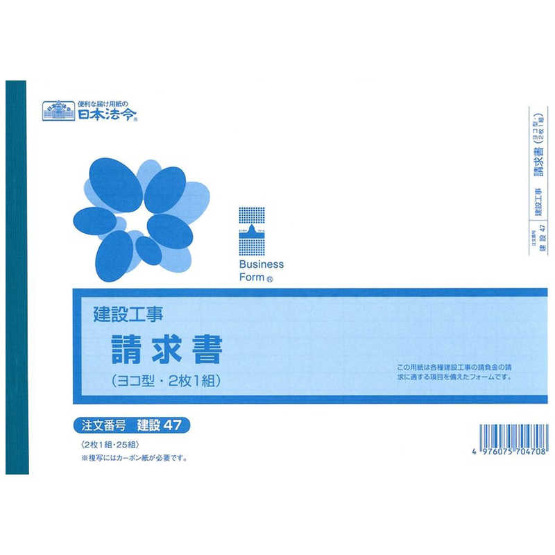 【商品解説】本商品は、B5ヨコ型の2枚複写で、各種建設工事の請負金の請求に適する項目を備えたフォームです。