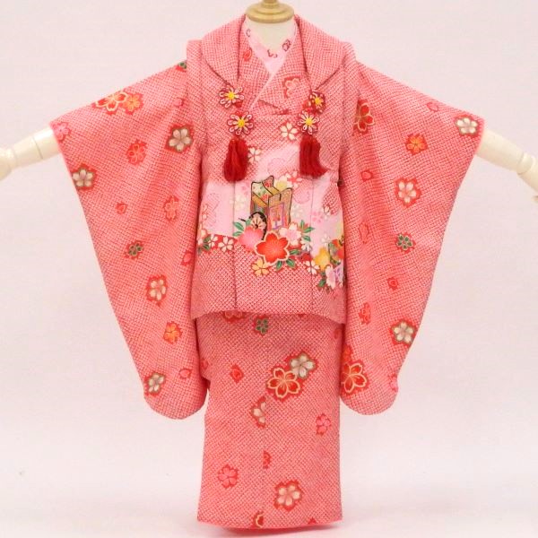七五三 3歳 【販売 】【中古】着物フルセット 赤 かのこに桜と御所車 髪飾りと着付け小物付き