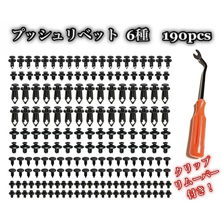 プッシュリベット 6種 190個セット クリップリムーバー付き プラスティ リベット ピン クリップ カーファスナー 190P