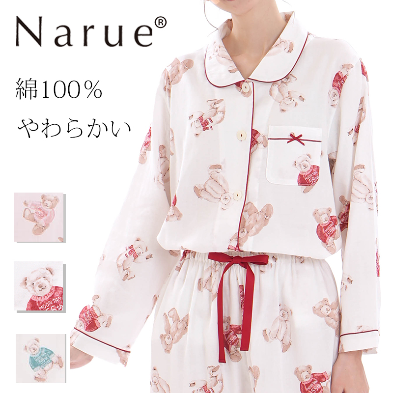 ナルエー公式 パジャマ ルームウェア 綿100% レディース 秋 冬 ピンク レッド グリーン M L コットンダブルガーゼテディーベアシャツパジャマ 25-71401