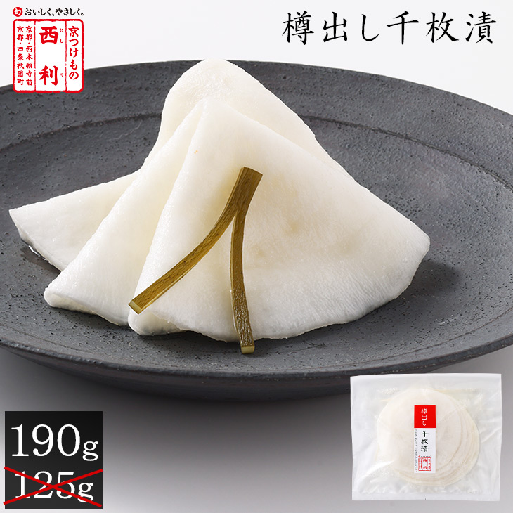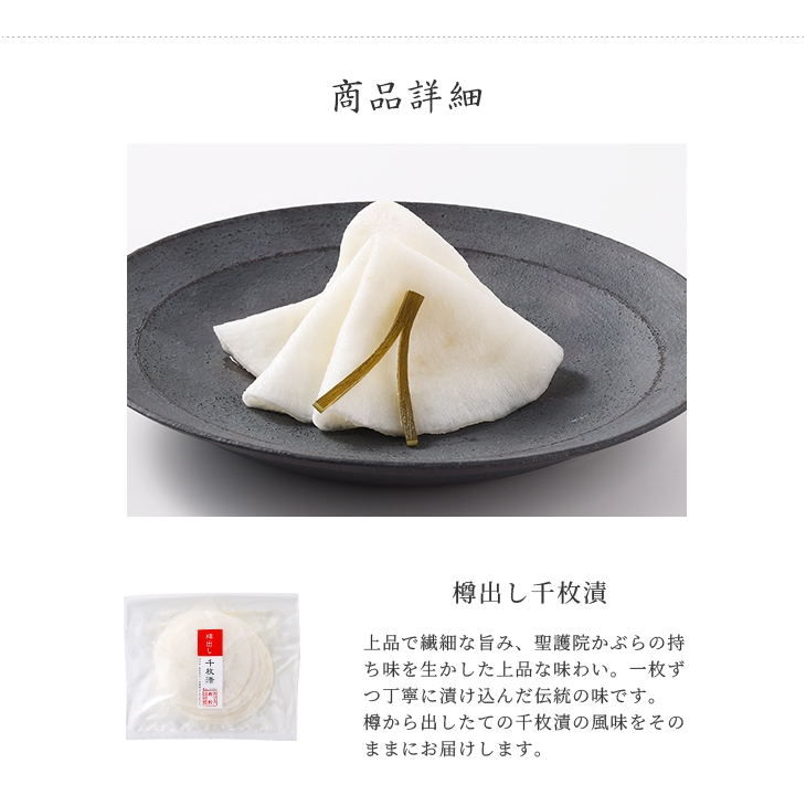 | 《樽出し千枚漬 190g》 ★☆★豊作に感謝!特別増量キャンペーン★☆★ 3月15日お届けまで 上品で繊細な旨み、聖護院かぶらの持ち味を生かした上品な味わい。 一枚ずつ丁寧に漬け込んだ伝統の味です。 樽から出したての千枚漬の風味をそのままにお届けします。 今シーズンは聖護院かぶらが大豊作のため、通常量125g→限定190gと特別に増量してお届けいたします。 冬の味覚をぜひお楽しみください。 ※ご自宅お届けの場合、ご注文いただいた商品を包装紙または専用ビニールで一括包装してお届けいたします。 (包装紙・ビニールをお選びいただくことはできかねますのであらかじめご了承ください。) ※手提げ袋は有料です。 ページ内の「手提げ袋は購入はこちら」から商品と一緒にお買い求めください。 |