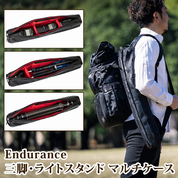 「三脚バッグに三脚しか入らないのはもったいない、長い物(三脚・ライトスタンドなど)も短い物(ストロボ・ストロボ関連機材・撮影小物)も入るケースを」というコンセプトの元、Enduranceカメラバッグシリーズを踏襲した機能性とデザインの今までありそうでなかった、機材用マルチケースが完成しました。