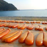 吹く風に少し寒さを感じ始める高知の秋の始まり。雨量も少なくなり、天日干しに最適の環境を迎えた宮進商店の工場前、富士ヶ浜では山々の紅葉より一足早く「からすみ」が色づき始めます。