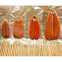 宮進商店のからすみは、天然の沖鯔の真子を素材としています。天然物であるために、色合いや形、大きさも様々です。色、形、厚みは様々ですが、適切な漁獲時期に獲れた張りのある真子を一腹一腹等しく、厚みや脂のりに応じて塩入りを調整し、天日干しにて熟成した「薄塩旨味」が特徴のからすみです。