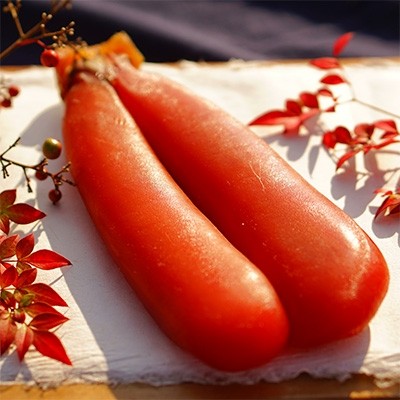 色合い、張り、弾力が頃合いの天然沖鯔の真子を素材に代々受け継がれ、さらに積重ねてきた門外不出の家伝継承製法で仕込み、天日熟成。