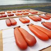 一腹ごとに塩の入り塩梅を調整するのは長く培われた手指の感触が重要です。塩入りを調整し、脂抜きされた真子は天日干し、圧し、整形を毎日繰り返し、「味、色合、型」の調和を大事に、香ばしく飴色のからすみに成るまで時間をかけてじっくりと作っています。天日による発酵・熟成期間に旨味が増すとともに塩の角がとれまろやかな味わいになります。