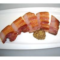 例1. ベーコンを1cmぐらいの厚切りにして、テフロンのフライパンで油をひかず、きつね色になるまで両面を焼いて厚切りステーキに。