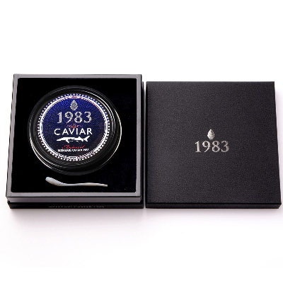 宮崎県産のチョウザメの卵を岩塩のみで薄く味付けし、60日以上かけて熟成させた「宮崎キャビア1983」は、熟成によって生まれる濃厚な旨味と、粒の美しい艶と輝きが特徴です。