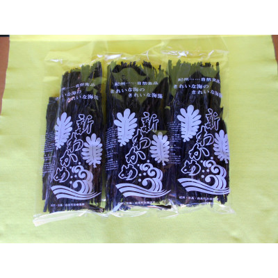 紀州のきれいな海『紀州由良町 衣奈湾』で育った天然養殖栽培わかめです。毎年、11月下旬頃ロープに種付けをして、翌年1月〜2月まで北風にさらし、寒風の時期に収穫します。