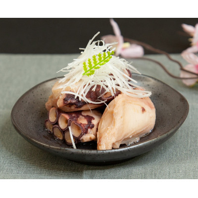 タコ本来の食感を残しつつ、柔らかく噛み切れるようにボイルし、 醤油ベースのタレで仕上げております。