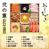 伊達巻/黒豆/梅餅/紅白蒲鉾/鰹くるみ/栗きんとん/たたきごぼう/だし巻/豚角煮/蟹爪柚庵焼/若桃甘露煮/お祝い松葉串