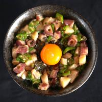 (2) 酢飯、又は白米にきざみのり、漁師飯の具、卵黄、白ごまをお好みで載せて出来上がり。