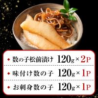 【内容量】数の子松前漬け120g×2P、味付数の子120g×1P、お刺身数の子120g×1P
