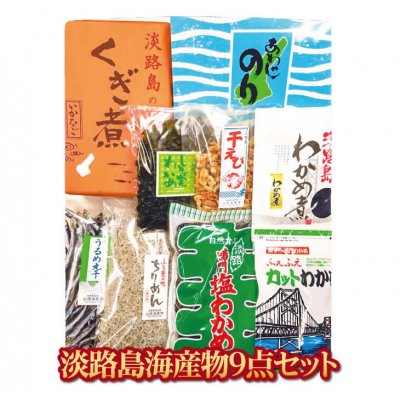 くぎ煮紙箱入り350g、あわじのり3本入り、わかめ煮紙袋入り240g、ちりめん130g、塩ワカメ220g、うるめ丸干130g、干しえび50g、しその実わかめ160g、カットわかめ25g/南あわじ市