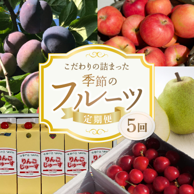 サクランボ(7月中)、プルーン(8〜9月頃)、洋ナシ(10〜11月頃)、リンゴ(11〜12月頃)と、リンゴ5種類を絞った無添加ストレートジュース(2月中)を定期便としてお届けします。