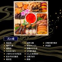 筑前煮、梅型人参、蓮根煮、たたきごぼう、子持ちわかさぎ昆布、紅あずま甘露煮、椎茸煮、高野豆腐、味付けいくら(40g)、穀類の甘辛煮、ぶり照り焼き、にしん奉書巻き、京餅手まり、酢豚、合鴨串照り焼き、伊達巻