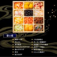 海鮮マリネ、きんとん、栗甘露煮、イカのゴロゴロサラダ、海の幸サラダ、黒豆、紅白なます、イカ真砂和え、サーモン塩麹漬け、金胡麻マグロの佃煮、若草チーズ和え、味付け数の子、にしん大漁漬け