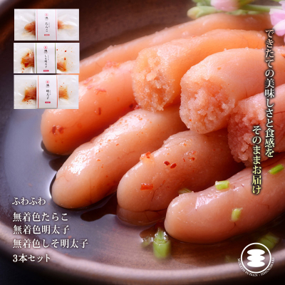 ふわふわ無着色たらこ35g、ふわふわ無着色明太子35g、ふわふわ無着色しそ明太子35g