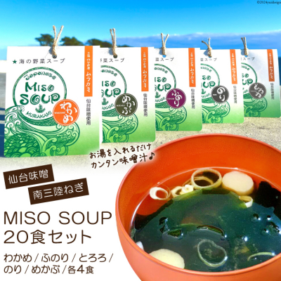 第46回 宮城県水産加工品品評会で最高賞である「農林水産大臣賞」受賞!宮城県産食材にこだわった点や味、市場性などを高く評価いただきました。毎日の食卓に欠かすことのできないお味噌汁を贅沢に味わい楽しんでいただきたい想いから、三陸の栄養を豊富に蓄えた海藻本来の味を、風味豊かな「仙台味噌」と太平洋の海風をたっぷり浴びて甘みが増して柔らかい「南三陸ねぎ」とのコラボレーション商品「MISO SOUP」が誕生しました。お湯を注ぐだけで、たっぷり入った海藻の豊かな風味と食感を味わうことができます。家庭の味を出すために手作りにこだわりました。気仙沼市に来ていただいた観光客や若い方に手に取っていただけるようにパッケージを岩井崎の荒波をモチーフにしました。品評会でもパッケージを評価いただき、うれしく思います。■商品内容MISO SOUP-わかめ-4食MISO SOUP-ふのり-4食MISO SOUP-とろろ-4食MISO SOUP-のり-4食MISO SOUP-めかぶ-4食■原材料名【調味味噌】みそ(国内製造)、食塩、砂糖、昆布エキス、かつお節エキス、酵母エキス、こんぶ、かつお節粉末/調味料(アミノ酸等)、アルコール、(一部に大豆含む)【具】・わかめ:わかめ(三陸産)、ねぎ(宮城県産)、ふ(小麦含む)・めかぶ:めかぶ(三陸産)、ねぎ(宮城県産)、ふ(小麦含む)・のり:のり(三陸産)、ねぎ(宮城県産)、ふ(小麦含む)・とろろ:こんぶ(三陸産)、ねぎ(宮城県産)、ふ(小麦含む)・ふのり:ふのり(三陸産)、ねぎ(宮城県産)、ふ(小麦含む)■消費期限各種常温120日■アレルギー表示(特定原材料)小麦,大豆