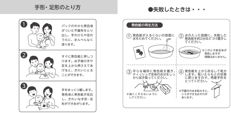 赤ちゃんの手足をインクで汚さずに、手形足形が残せます。失敗してもやり直しが可能です。