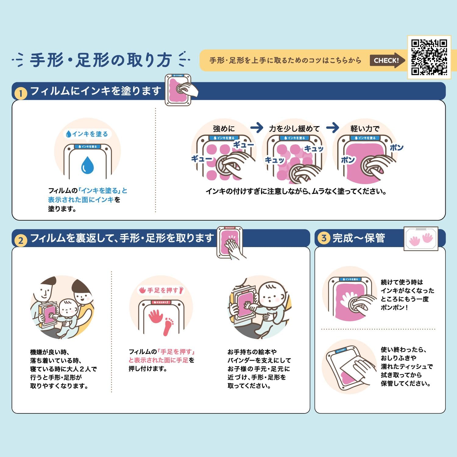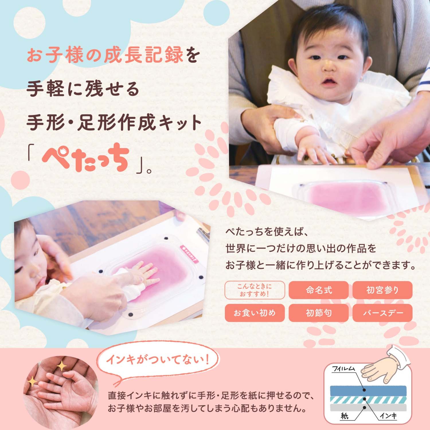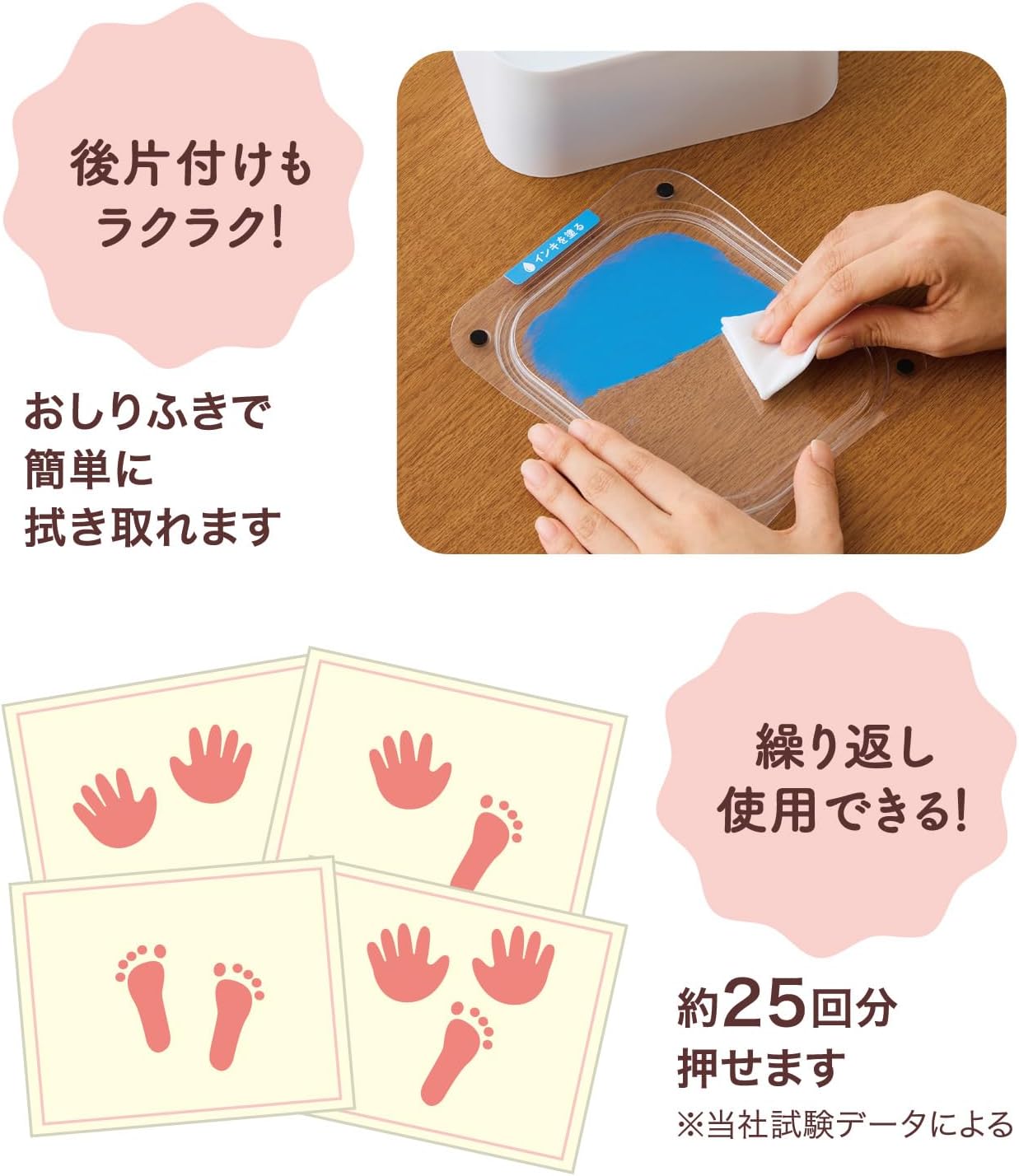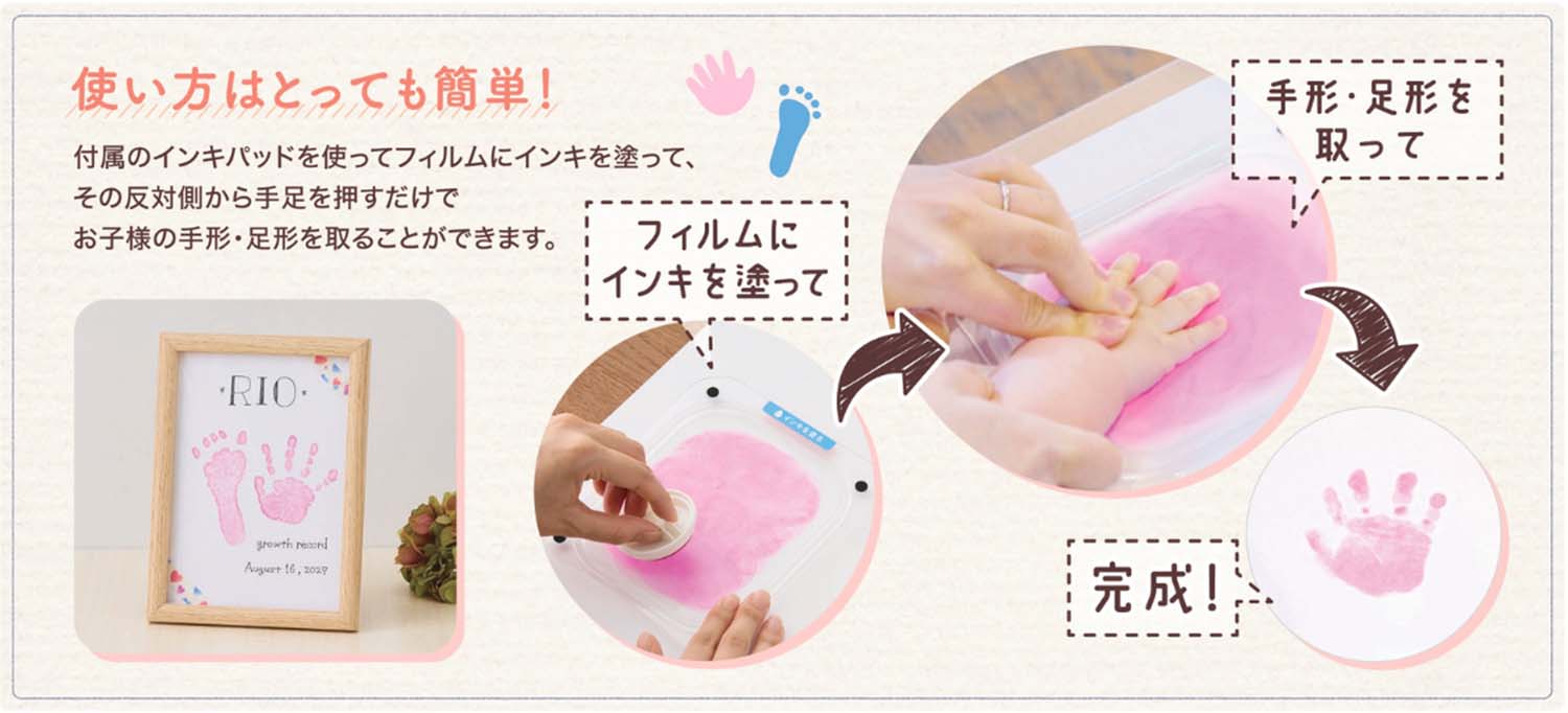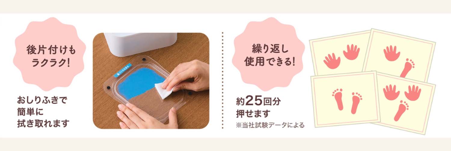 ・直接インキに触れずに手形・足形を紙に押せるので、お子様やお部屋を汚してしまう心配もありません。