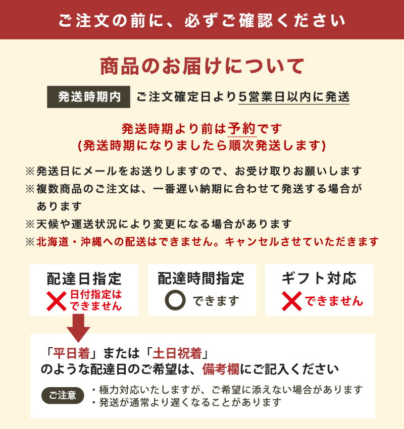| ●発送開始時期:11月中旬頃〜(発送終了は6月下旬頃の予定です) 【発送時期前…予約:発送開始時期になりましたら順次発送】 【発送開始後…通常:注文確定日より10営業日以内に発送】 ●配送日指定について 【特選・鹿蔵プレミアム】7営業日以降の配送日の指定が可能です(備考欄にご記入ください)※発送期間内でも在庫状況によりご指定いただけない場合があります 【訳あり・超訳あり】配送日の指定はできません ●生育・収穫状況によっては時期が前後する場合もございます。配送日指定が承れない場合がありますので、ご了承ください ●発送日にメールでお知らせいたします ●複数商品をご注文の場合は、一番遅い納期となることがあります ●北海道・沖縄への配送はできません(注文キャンセルさせていただきます) ●配送時間帯のご指定は可能です |