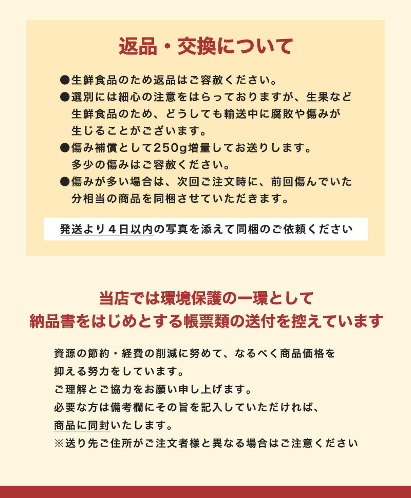 | ●配送中の腐敗防止のため未完熟の状態で出荷しています。追熟させた上でお召し上がり下さい ●生育や収穫の状況により、出荷の時期が前後する場合がございます ●食品のためお客様都合によるキャンセルや返品はできません ●青果は収穫後も呼吸し水分が少しずつ放出されます。出荷時にその分を考慮して多めにしていますが、到着時に重量が予想より減る場合がございます。また追熟や保存時にも水分が放出されますので、ご了承ください ●防腐剤の使用を極力控えているため、傷みやすい傾向があります。このため250g増量して発送させていただきます。 ●ご不在等により発送から4日(発送日含む)を超えてお受け取りになった場合、果実に傷みが生じていても保証対象外となります |