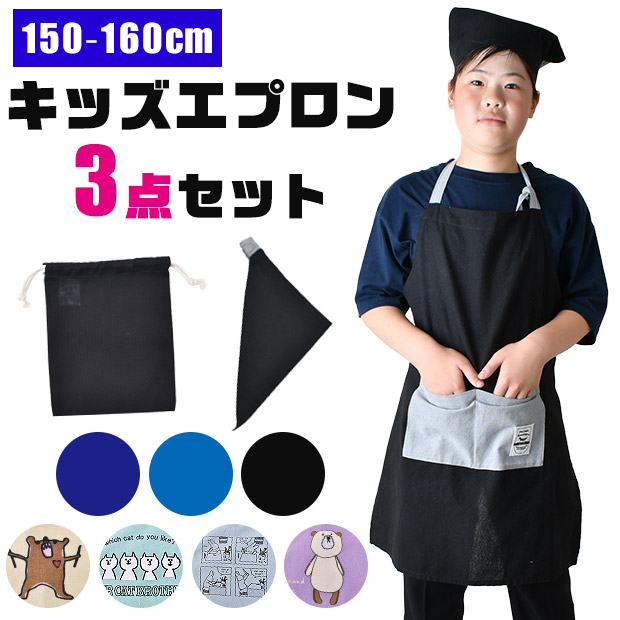 キッズ エプロン 3点セット 子供用 三角巾セット 巾着 ジュニア 150cm 160cm ポケット付き ホルターネック プリント 小学生 調理実習 ネームタグ付き 送料無料
