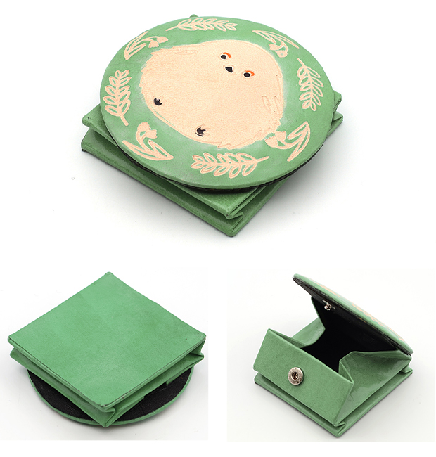 山羊革に型押しで模様をデザインし、カラフルにペイントしています。