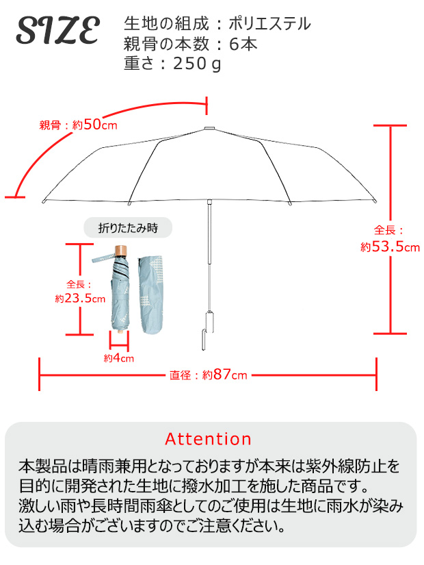 ●サイズ:【親骨】約50cm【全長】約53.5cm【直径】約87cm※折りたたみ時は約24cm詳細は画像にてご確認下さい●重さ:約250g●カラー:6タイプ/全18色【23-3312】33/サックス【23-3312】98/グレー【23-3312】99/ブラック