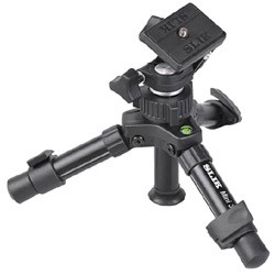 小型一眼レフカメラに対応する、しっかりしたテーブル三脚。台の上に置いて記念撮影を。接写に便利なローポジション専用三脚です。