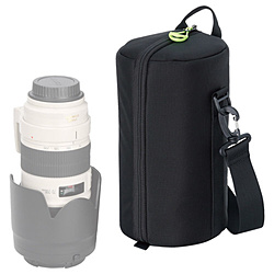 適度なクッション厚とソフトなクッション素材でレンズを保護。かさばりにくく、持ち運びのしやすいショルダーベルト付きレンズポーチです。