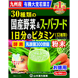 | 原材料 | 有機大麦若葉、黒糖、野菜粉末、米麹(米、麹菌)、乳糖(乳成分を含む)、乳酸菌YK-1、ウコン、サラシア、ナツメの実、はとむぎ、マカ、高麗人参、ユーグレナ/ビタミンC、抽出ビタミンE、ナイアシン、パントテン酸Ca、甘味料(ソーマチン)、ビタミンB1、ビタミンB2、ビタミンB6、ビタミンA、葉酸、ビオチン、ビタミンD、ビタミンB12 |