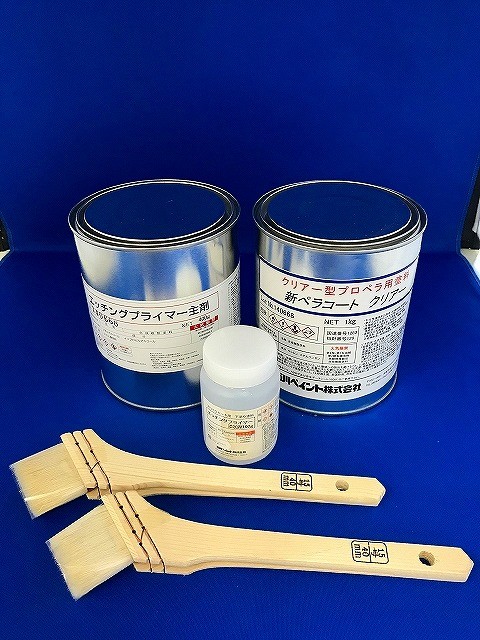 主剤に添加剤を入れよく混ぜ合わせ、1本目の刷毛で塗装して下さい。