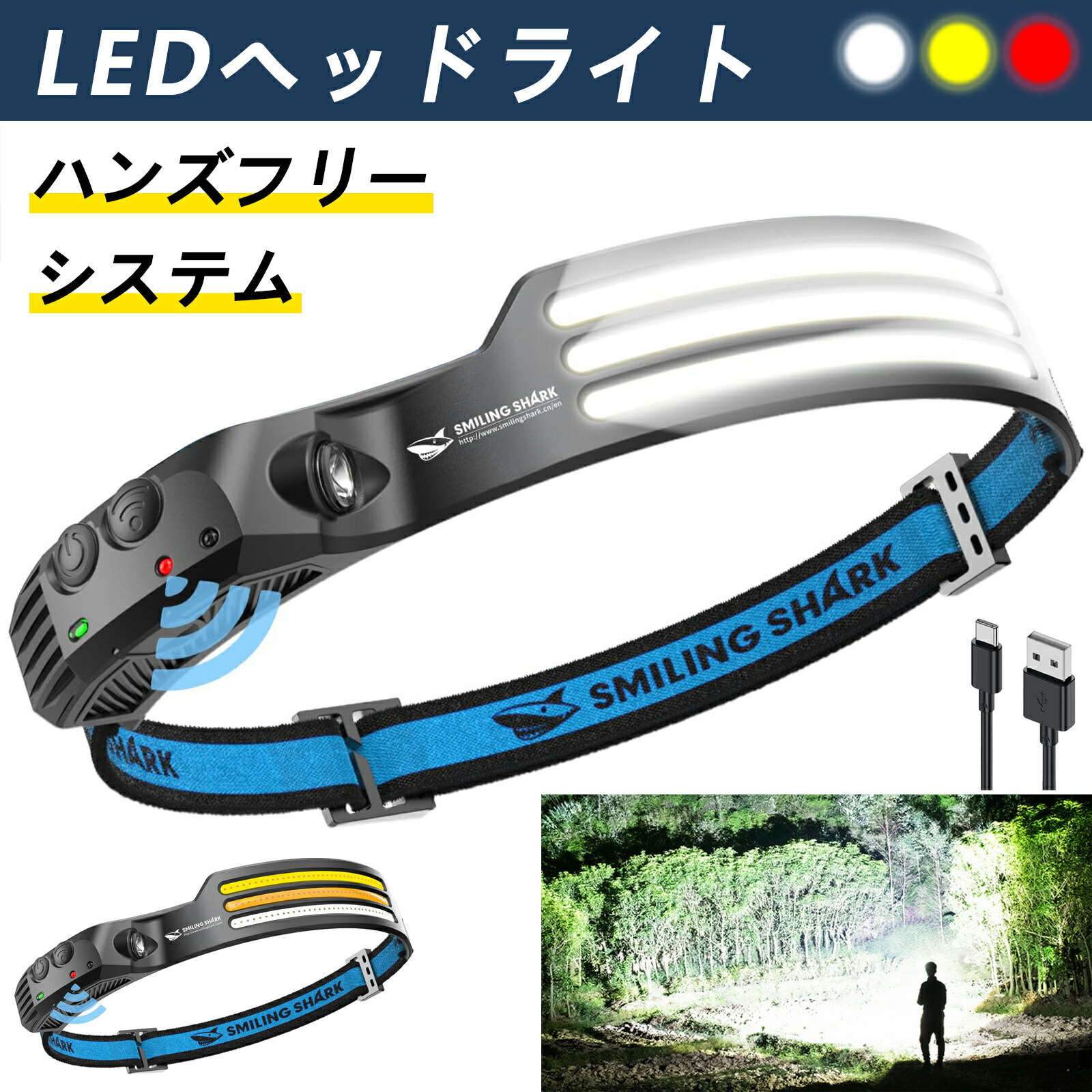 ヘッドライト led 充電式 USB充電 三色変光 230°広角照明 Smiling Shark 集光 超軽量 防水防塵 8時間連続使用キャンプ 登山 散歩 釣り 停電用 防災 人気