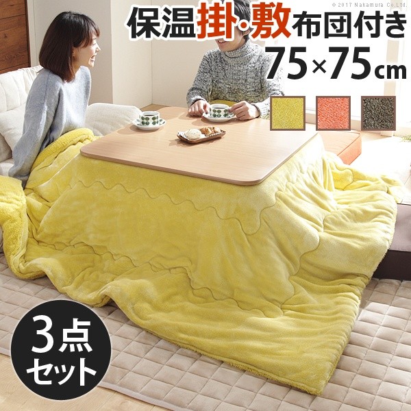 こたつ 折りたたみ フラットヒーター折れ脚こたつ 〔フラットモリス〕 75x75cm+保温綿入り掛布団無地+撥水フランネル敷布団 3点セット 正方形