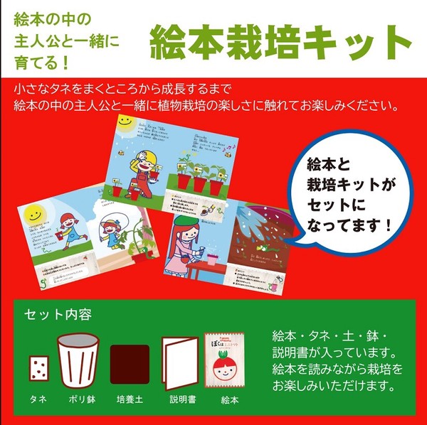 絵本を読みながらセットの栽培キットで栽培も楽しめます♪デザインは絵本作家 ムライタケシ氏にお願いしました。