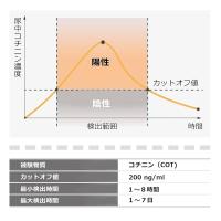 喫煙時に体内に吸収されたニコチン代謝物「コチニン」の尿中含有量を測定 99%以上の精度で検出します(カットオフ値200ng/ml)