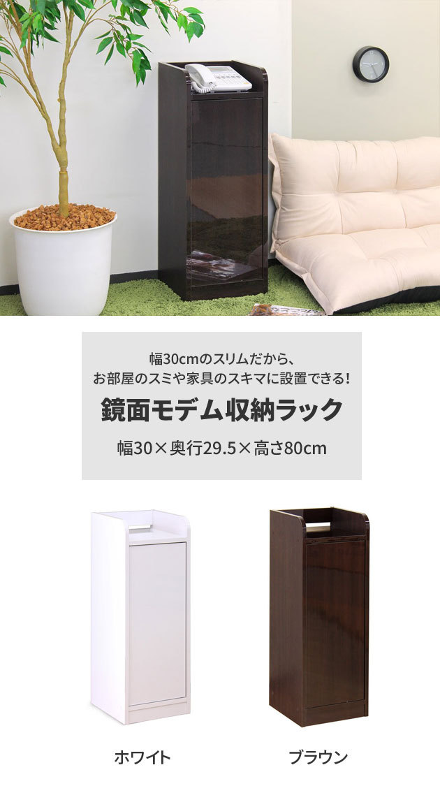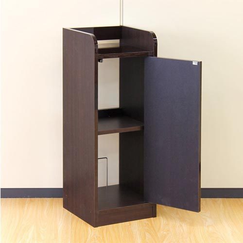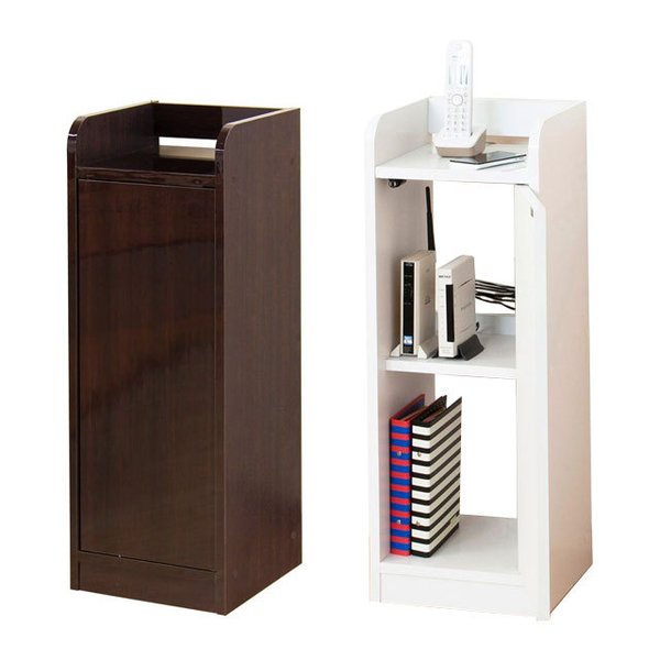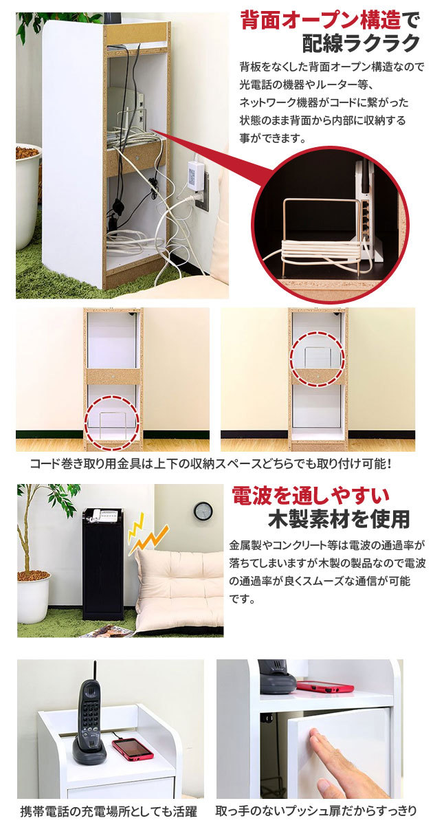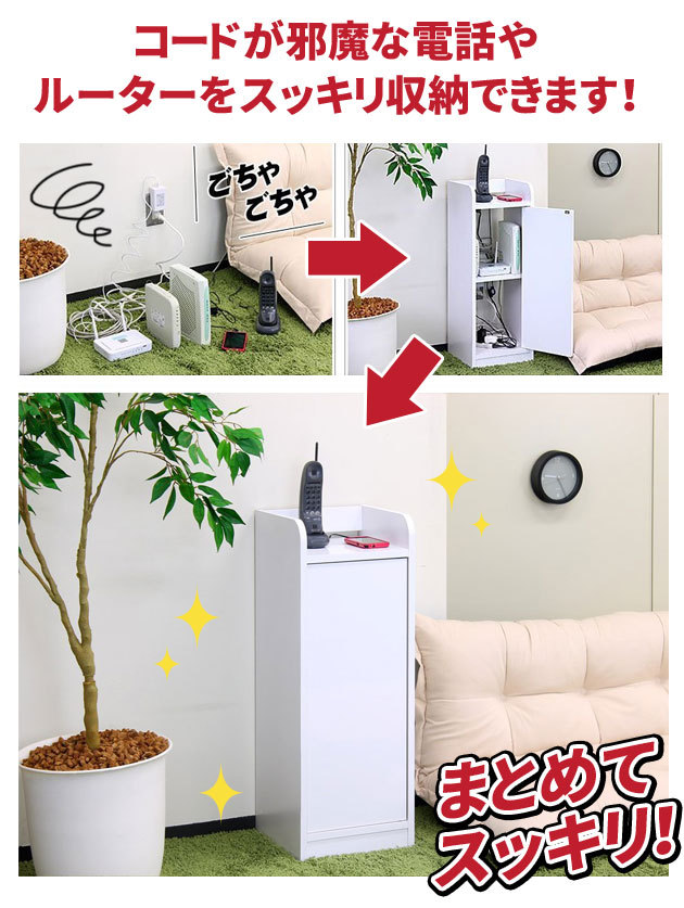 | 幅が約30cmとスリムなので、お部屋のスミや家具のスキマに設置できます。扉内はモデムやルーター、光電話の機器、タップなどまとめて収納でき、乱雑になりがちなコードをスッキリ整理できます。またA4ファイルや電話帳を立てて収納することもできます。 | |