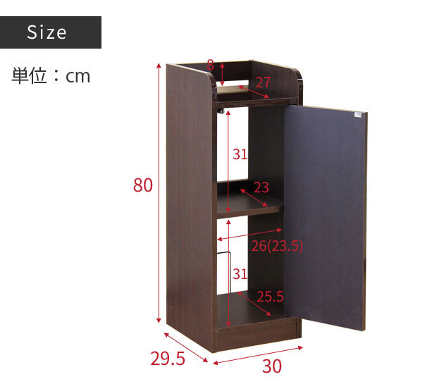 | サイズ | (約)幅30×奥行29.5×高さ80cm 扉内棚板は固定棚 扉内内寸 上部/(約)幅26(23.5)×奥行23×高さ31cm 下部/(約)幅26(23.5)×奥行25.5×高さ31cm 空間内寸 天板上/(約)幅26×奥行27×高さ8cm |