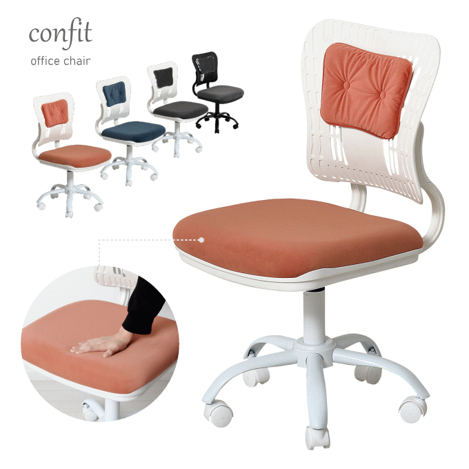 | 背もたれの動きにより自然な姿勢の変化が生まれて快適な座り心地を体感できます。ガス圧式の昇降機により無段階の座面調節が可能です。 肘なしタイプなのでデスク下に収まり、見た目もすっきりします。 脚フレームは頑丈なスチール製。張地のカラーを引き立たせるホワイトカラーが施されています。キャスターはPPキャスターを使用。プラスチック製よりも硬くて柔軟性があるうえ、割れにくくゴム製より耐久性が高いのが特徴です。一般的なキャスターに比べ耐久性・耐摩耗性に優れています。 丸いフォルムに加えて座り心地も抜群! 背もたれクッションは取り外し可能で位置を変えられます。座面はふっくらとした座り心地の良い座面です。座面・背もたれクッションは柔らかく触り心地の良いファブリック生地です。 |