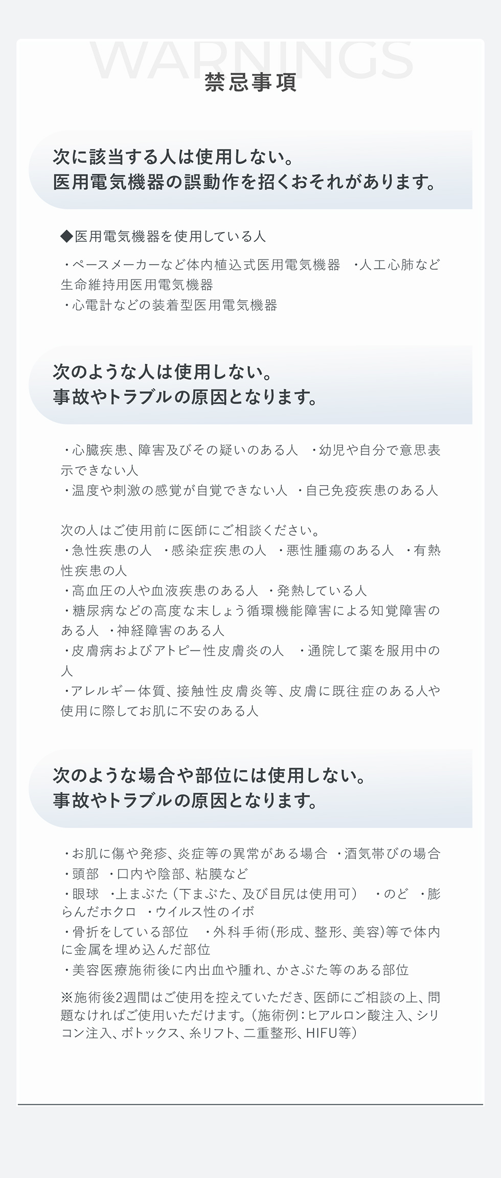 ・お肌に傷や発疹、炎症等の異常がある場合 ・酒気帯びの場合 ・頭部 ・口内や陰部、粘膜など
