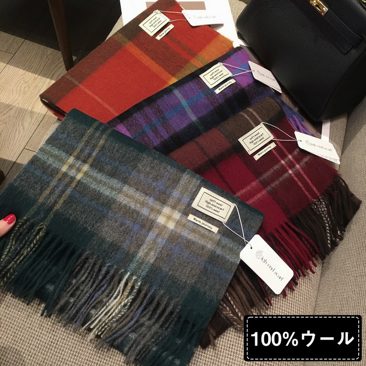 マフラー 100%ウール きれいめ チェック柄 フリンジ ショール 秋冬 防寒 レディース メンズ