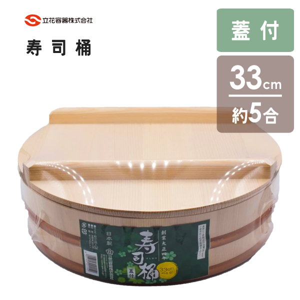 新寿司桶 33cm (蓋付) 立花容器 / 日本製 約5合 木製 白木 ちらし寿司 飯台 おひつ Pタガ プラスチック製タガ 便利 丈夫 /