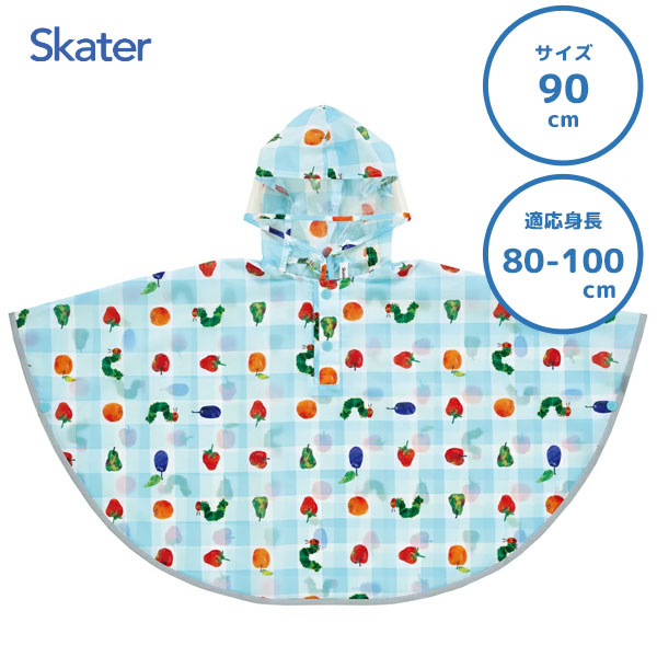 キッズレインポンチョ 90cm はらぺこあおむし ギンガムチェック スケーター RAPO2 / 雨具 カッパ レインコート 収納袋 フード付き 子供 キッズ 腹ペコ 青虫 絵本