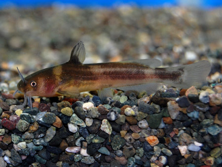 ナマズの様な体つきで8本のヒゲを持ち、体色は茶褐色〜黒褐色で脂鰭があります