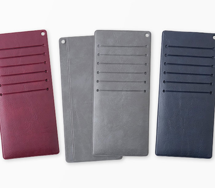 軟質の塩ビを使用しエッジ処理も丁寧なので、手ざわり、指あたりもとてもソフトです。落ち着きのあるレザー調の型押しの生地はどんなお財布にも合わせられます。